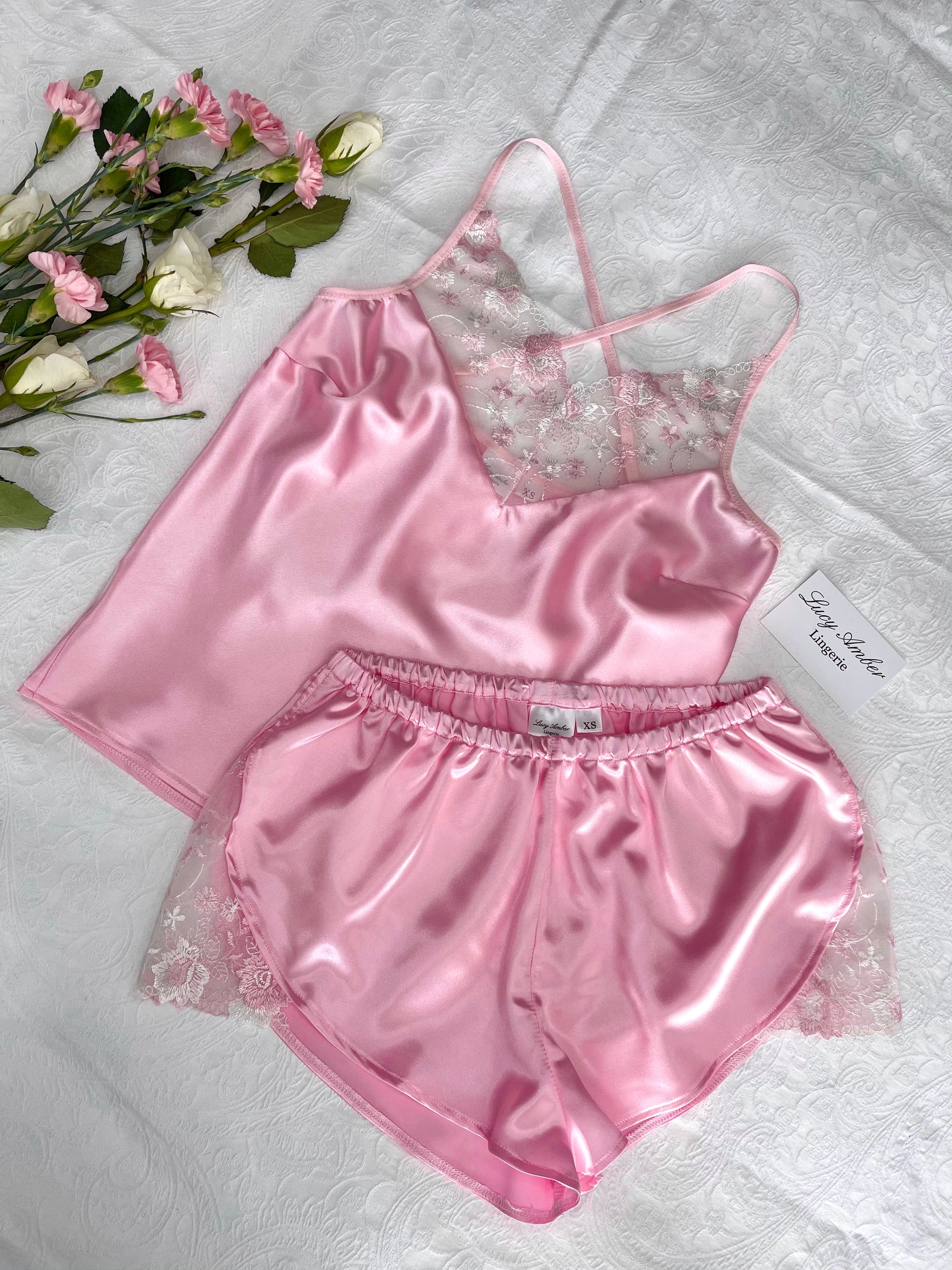 Handmade Ophelia night set with adjustable straps. This set is handmade from silky satin and beautiful embroidered lace with rose gold hardware.