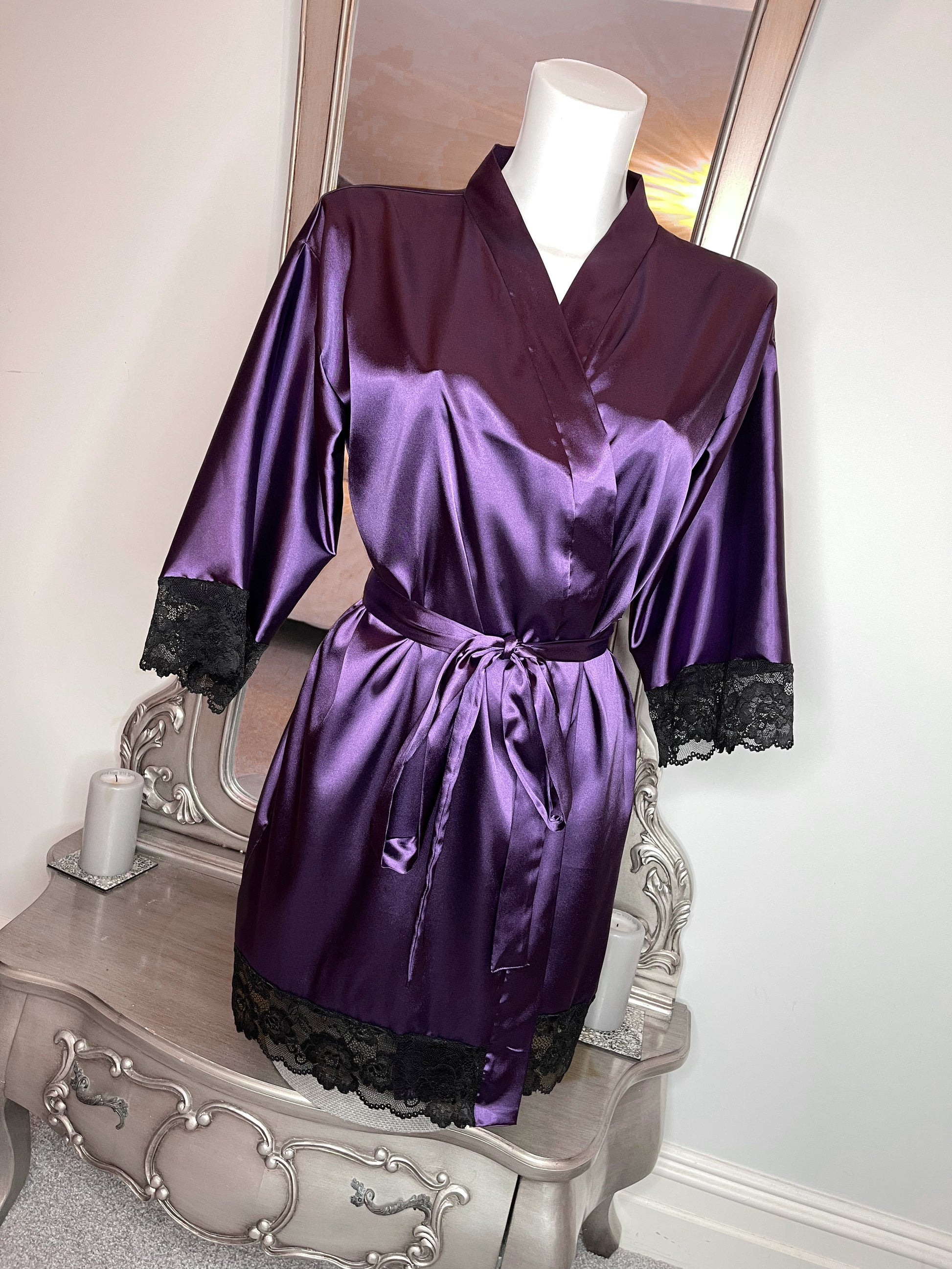 Handmade Naomi Robe. This robe is handmade from a beautiful dark purple silky satin and lace.