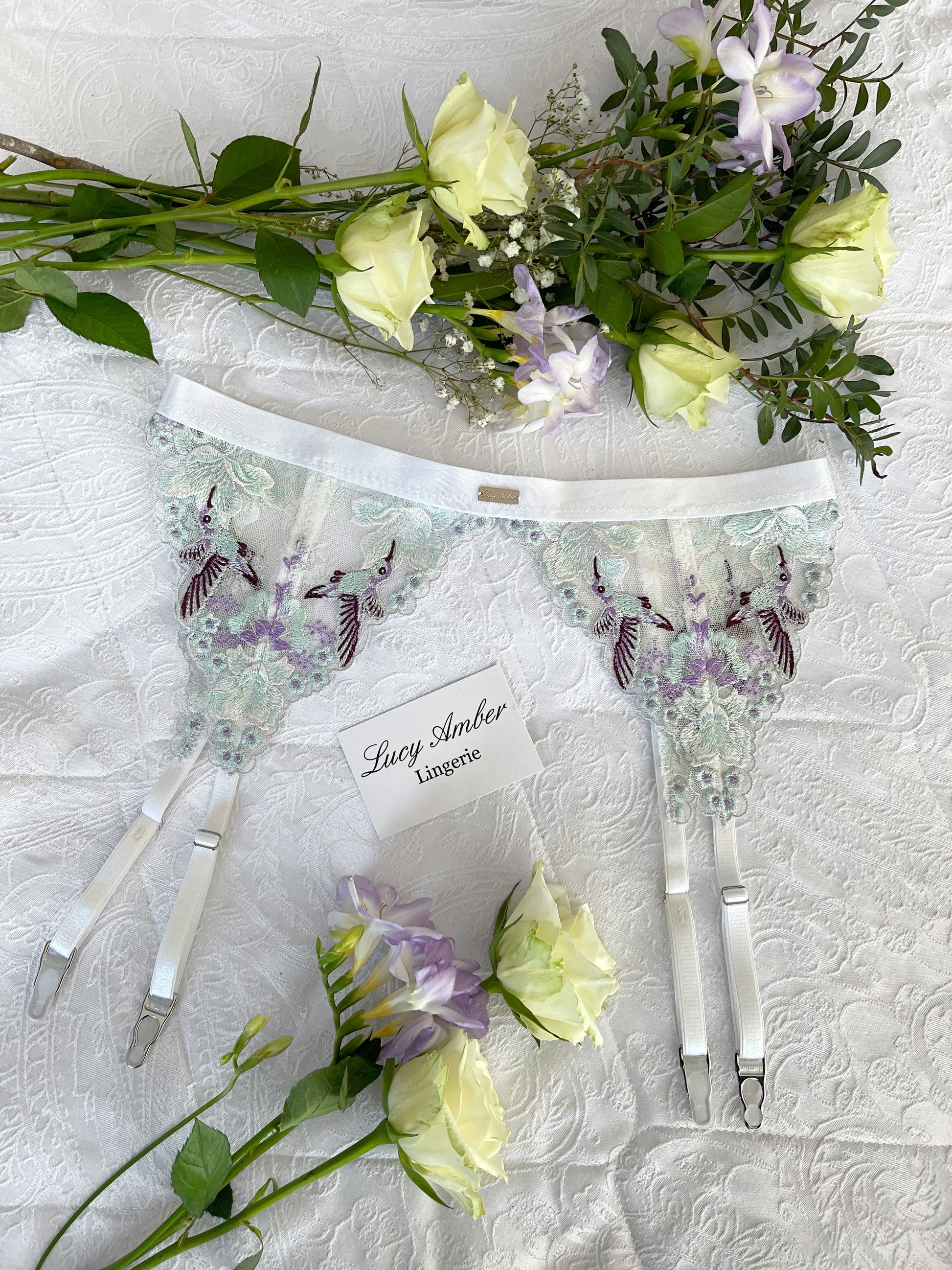 Handmade Birdy suspender belt, made from a soft embroidered lace with adjustable clips and back closure.