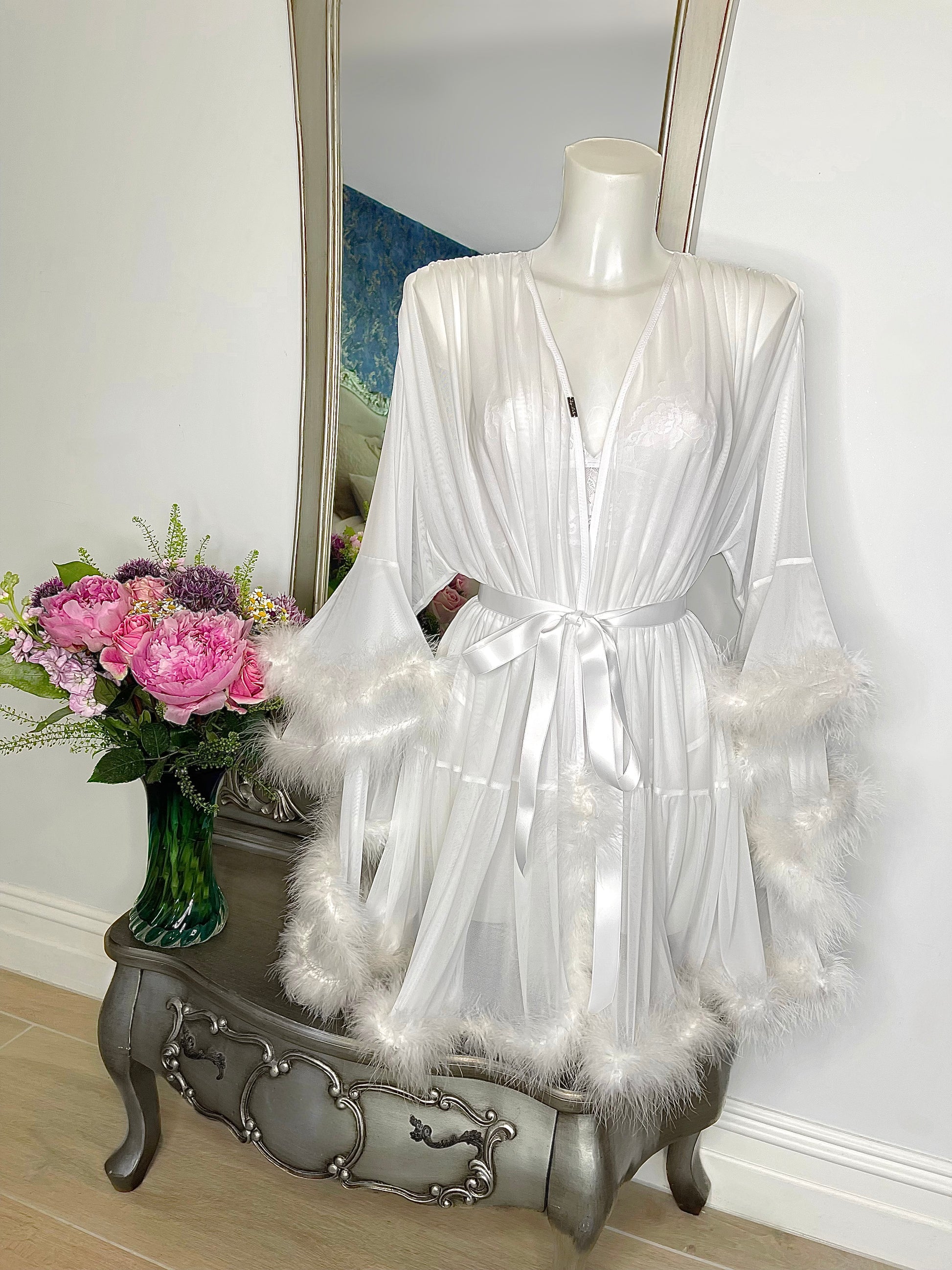 This short white mesh vintage Hollywood inspired robe is handmade from a super soft stretchy mesh with a feather trim and ribbon belt.